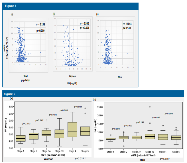After this, to establish a possible correlation between eGFR and UA concentrations, we compared them in the general population and both genders independently (Figure 1). Then, we found that in women basal UA indices were negatively correlated with eGFR (r= -0.138, p= 0.009; r= -0.300, p <0.001, respectively), although we obtained satisfactory results in the general population and women correlation (Figure 1a,b) we did not observe significant correlation between basal UA and eGFR in men (r = -0.041, p= 0.539) (Figure 1c).
