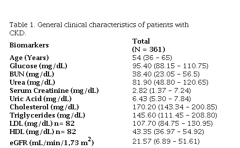 A database corresponding to 443 patients was analyzed, of which only 361 met the inclusion criteria. Of all the patients diagnosed with CKD, 63% were men and 37% women. The median age was 54 years with its quartiles (Q25 – Q75 36-65) (Table 1). According to the data obtained from blood chemistry, apparent changes in the renal profile (BUN, urea, serum creatinine, and uric acid) were observed because they were elevated concerning their reference values. Furthermore, the central tendency values in GFRe, 21.57 mL/min/1.73 m2 (Q25 – Q75 6.89 - 51.61), showed a severe renal decline.