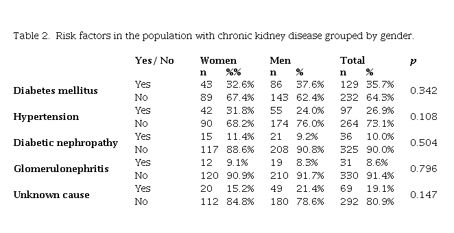 In this sense, the leading risk factor for kidney disease for both genders was hypertension (67.4% in women vs. 62.4% in men), followed by diabetes mellitus (32.6% in women vs. 37.6 % in men), diabetic nephropathy (11.4% in women vs. 9.2% in men), glomerulonephritis (9.1% in women vs. 8.3% in men) and other unknown causes (15.2% in women vs. 21.4% in men). None of these risk factors present in CKD patients showed statistical significance between genders (Table 2).