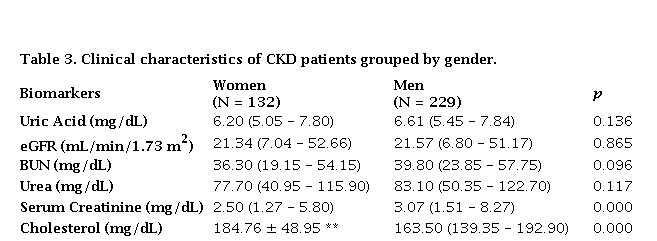 The renal prognostic biomarkers grouped by gender are summarized in Table 3. The results obtained from UA determination showed hyperuricemia in both genders (women >6.20 mg/dL vs. men >6.5 mg/dL), with no statistical differences. Moreover, in the biomarkers of renal function, median eGFR showed a severe decrease in renal function in both genders with (21.54 mL/min/1.73 m2 in women vs. 21.57 mL/min/1.73 m2 in men). Also, the analytes that showed to be statistically significant were CrS and cholesterol (p=0.015, p=<0.01).