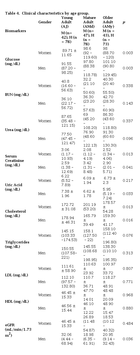 Subsequently, we analyzed men and women separately in three age groups (AJ, AMd, and AMy). For this case, multivariate analysis showed hyperglycemia with increasing age. As a result, the management of hyperglycemia in patients with (CKD) presents complex challenges that trigger the generation of free radicals and oxidative stress and reduces the replication capacity in selected renal cell populations, either directly or indirectly, leading to loss of cell replication and repair capacity 21 .