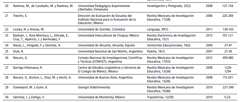 El proceso de selección de artículos se dividió en dos etapas. En la primera etapa de búsqueda, se seleccionaron los artículos con las palabras: educación intercultural y diversidad cultural en el título o en el contenido del artículo. Con estos criterios se tuvo 98 artículos. En la segunda etapa, se revisaron los textos seleccionados en la primera etapa, y fueron elegidos para el análisis de contenido aquellos artículos que cumplen con la condición de ser reporte de estudio empírico en Latinoamérica. Finalmente, se trabajó con 30 reportes de investigación ( Tabla 1 ).