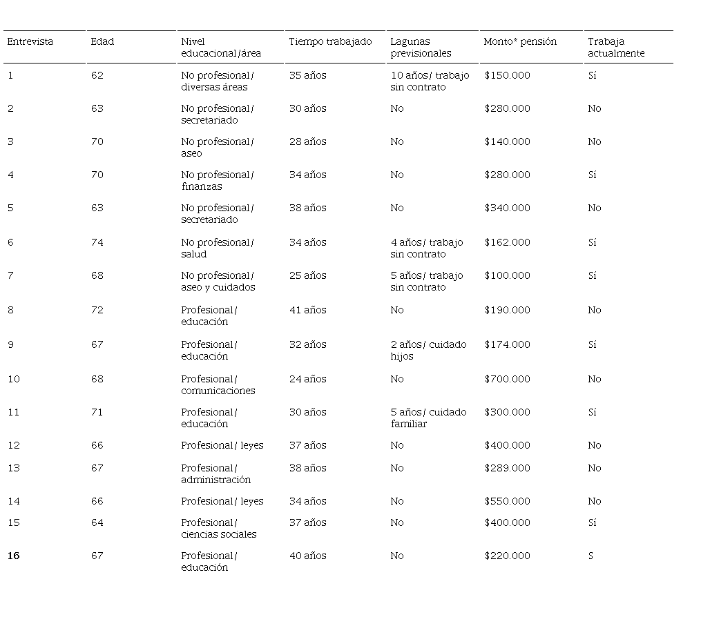 Se utilizó muestreo intencional, seleccionando a las participantes en función de las posibilidades que brindaban para ofrecer información profunda y detallada sobre la temática investigada. La estrategia de acceso a la muestra fue de bola de nieve, que implica contactar a los casos a partir de recomendaciones de interés para el estudio (Martínez-Salgado, 2012). De este modo, y como se observa en la Tabla 1, las participantes fueron 16 mujeres pensionadas por el sistema de AFP: 7 de ellas no profesionales y 9 profesionales. La gran mayoría tenía hijos/as, solamente una difería en este aspecto. Las entrevistas fueron realizadas entre los meses de mayo y junio de 2015.