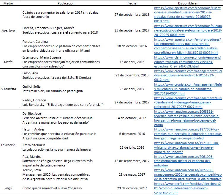 La selección de material empírico se produjo bajo los siguientes parámetros: se tomaron 24 artículos de las secciones Economía, Negocios, Management y Emprendedores de tres medios nacionales, seleccionados por alcance y especificidad temática de sus secciones o suplementos, en sus versiones on line: La Nación, Clarín y El Cronista, entre diciembre del año 2015 y octubre del 2017. Este período seleccionado responde al año en el que finaliza en la Argentina un gobierno de orientación nacional y popular y la llegada de Propuesta Republicana (PRO) a la presidencia en el año 2015, el cual se consolida como fuerza política en las elecciones legislativas del año 2017, respecto de la distribución de bancas en las cámaras de Diputados y Senadores al momento de asumir éste el Poder Ejecutivo (Perfil, 2017, 23 octubre). La novedad de este fenómeno no se circunscribe sólo a la asunción de un partido político relativamente joven, sino especialmente al hecho que la mayoría de los funcionarios que pasaron a ocupar puestos de conducción política eran directivos de grandes empresas del país. Esto último es lo que constituye la verdadera novedad en la historia política argentina.