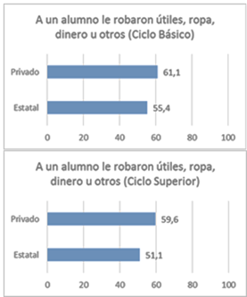 Referimos a incidentes que, al menos en las escuelas argentinas, suceden con frecuencia. De acuerdo con los datos aportados por el último relevamiento realizado por el OAVE, los reportes de atestiguamiento de robos por parte de estudiantes fueron más frecuentes en escuelas de gestión privada (Figura 1). El relevamiento del año 2010 se aplicó a una población constituida por estudiantes secundarios de segundo, tercero y quinto año de todas las jurisdicciones del país. Se censaron 277.959 estudiantes en 15800 divisiones de 7308 escuelas.