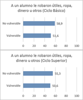 Una observación a estos datos podría dirigirse contra la heterogeneidad de establecimientos que en nuestro país se agrupan bajo los rótulos de “estatal” o “privado”. Si bien es cierto que no debe hacerse corresponder estas categorías con sectores sociales determinados, como veremos en el discurso de algunos de nuestros entrevistados, se trata de categorías que en el lenguaje coloquial constituyen marcadores de clase. Asimismo, al comparar los datos por nivel de vulnerabilidad el valor reportado es mayor para la población de estudiantes no vulnerables (Figura 2).