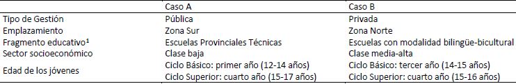 La selección de los establecimientos respondió a criterios teóricos en uno de los sentidos propuestos por Glaser y Strauss (1967) a saber; considerando la medida en que su inclusión podía ofrecer una manera diferente de interpretar la realidad, respecto a la ya conocida a partir de los estudios precedentes. Esto se torna particularmente relevante al observar, como señalamos en la introducción, que el campo de estudios argentinos ha desatendido a los sectores socio-económicos altos al abordar cualitativamente la violencia y la conflictividad. Esta vacancia nos ubicaba ante el potencial aporte teórico que podía significar la comparación entre centros educativos de sectores socialmente contrastantes. Dicho contraste se logró atendiendo los criterios descritos en la Tabla 1.