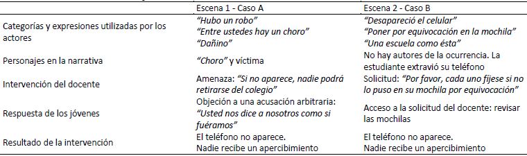 En principio, lo reportado por este informe, incluso con las observaciones que pudieran dirigírsele, no apoya que la relación entre robos en las escuelas y vulnerabilidad. social sea lineal. Sin embargo, a continuación veremos que las cifras se vuelven datos superfluos frente a lo que determinadas comunidades construyen como marco interpretativo para esta clase de incidentes disruptivos. Abordaremos una pregunta que nos permitirá una comparación más franca entre nuestros casos de estudio: ¿Qué sucede cuando “falta” un teléfono celular? Para ello, reproduciremos dos escenas etnográficas. La primera corresponde al Caso A y la segunda al Caso B. La Tabla 3 organiza el contenido de las narrativas emergentes de estas situaciones disruptivas.