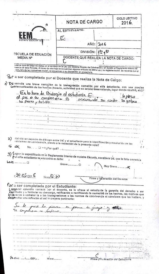 Las notas de cargo, por su parte, son documentos que se utilizan como medidas disciplinarias ante una falta desarrollada por un estudiante. Allí se vuelca la información acerca de la situación ocurrida, el o los estudiantes involucrados, el docente que interviene, el curso al que pertenece el estudiante. También se señala el nivel de gravedad de la situación, se especifica si hubo o no una instancia de diálogo entre los actores involucrados previo a la redacción de esta nota y se habilita un espacio para el descargo o la opinión del estudiante sobre la situación ocurrida. Esta nota, además debe ser firmada tanto por aquel adulto que la solicita como por el o los estudiantes que hubiesen participado en la transgresión. Este material es una fuente de información muy rica tanto sobre los conflictos que ocurren en las escuelas como sobre los modos en los que se dialoga acerca de los mismos (Figura 1).