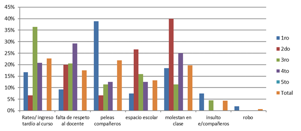 La primera causa de sanción es por evadirse de las clases -“ratearse”- o por ingreso tardío que se concentran básicamente en 3ro y 4ro año y es casi un cuarto de las situaciones de sanción con un 23% de los casos. En segundo lugar, están las peleas entre compañeros que se da en mayor medida en los estudiantes de 1er año.