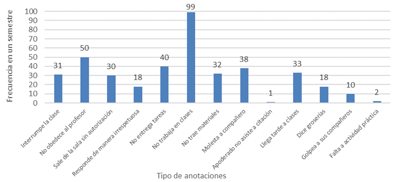Al analizar las dimensiones implicadas en las sanciones, podemos señalar que un primer grupo de ellas están vinculadas con aspectos sobre la focalización de la tarea escolar, es decir que los estudiantes pongan atención a la instrucción y que ejecuten el trabajo que se ha asignado para la clase, en este grupo pertenecen las anotaciones no trabaja en clase, no obedece al profesor y no entrega tareas y que representan una de las primeras causas por las que se registran anotaciones negativas. Un segundo eje lo constituyen las anotaciones que refieren al seguimiento de rutinas y procedimientos que se establecen en la clase como la puntualidad en la entrada a clases, su permanencia en la sala durante el periodo de instrucción y el cumplimiento con el material que se ha solicitado. En este grupo encontramos anotaciones como llega tarde a clases, sale de la sala sin autorización, no trae materiales y falta a actividad práctica. Un tercer grupo está compuesto de aquellas anotaciones que se vinculan con aspectos de la convivencia en el aula y que incluyen las interacciones entre estudiantes con profesores y entre pares como “molesta a un compañero, responde de manera irrespetuosa, dice groserías y golpea a sus compañeros, interrumpe la clase.”