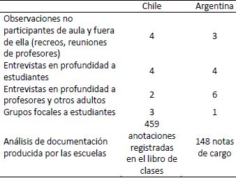 En ambos casos se realizaron observaciones no participantes del aula, grupos focales y entrevistas en profundidad a estudiantes, profesores y directivos (ver Tabla 1), las que permitieron identificar un dispositivo clave en la regulación de las relaciones entre profesores y estudiantes y en el manejo de las situaciones de disrupción y conflicto en el aula. En el caso argentino se identificó como dispositivo clave las notas de cargo, y en el caso chileno, las observaciones (anotaciones positivas y negativas) registradas por los profesores en el libro de clase.