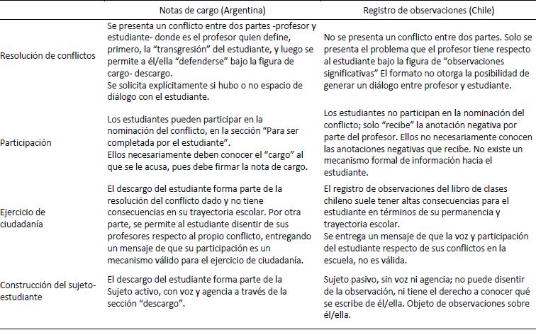 Respecto del criterio de participación de estudiantes, en Argentina, a través del dispositivo notas de cargo los estudiantes pueden participar en la nominación del conflicto, en la sección “Para ser completada por el estudiante”. Ellos necesariamente deben conocer el “cargo” al que se le acusa, pues debe firmar la nota de cargo. En cambio, en Chile, a través del registro de observaciones del libro de clases los estudiantes no participan en la nominación del conflicto; solo “recibe” la anotación negativa por parte del profesor. Ellos no necesariamente conocen las anotaciones negativas que recibe. No existe un mecanismo formal de información hacia el estudiante.