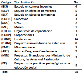 Las personas que dirigen los proyectos formativos en contextos de encierro se distribuyen al interior de un gran abanico de instituciones y organizaciones: grupos de universitarios, ONG, corporaciones, fundaciones, escuelas, entre otras. Las edades de quienes lideran o coordinan los proyectos también son de un amplio espectro, los más jóvenes tienen alrededor de 22 años, hasta quienes han continuado liderando proyectos educativos en contextos de encierro una vez jubilados.