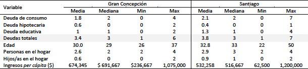 En la Tabla 1 se presentan los principales descriptivos sociodemográficos útiles para contextualizar la situación económica del hogar. Los datos se presentan separados por localidad geográfica. La construcción de la base de datos para estimar las variables descriptivas se realizó mediante la revisión de cada una de las entrevistas, en las cuales las personas explicaban su situación socioeconómica. Los valores sobre la cantidad y el tipo de deuda, es la información que corresponde a lo declarado en cada entrevista. Son, por tanto, valores estimados. Salvo en dos casos donde una de las parejas no entregó información explícita sobre su ingreso personal, sin embargo, se utilizó el dato disponible de la pareja como el ingreso total del hogar. En el caso de los montos adeudados fue más difícil realizar la reconstrucción debido a que la información entregada era muy variada y poco precisa. Por ello, no se presentan datos.