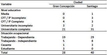 En ese marco y a partir de una estrategia metodológica cualitativa, se llevaron a cabo 34 entrevistas semi-estructuradas a parejas jóvenes profesionales y trabajadoras de Santiago y Concepción.