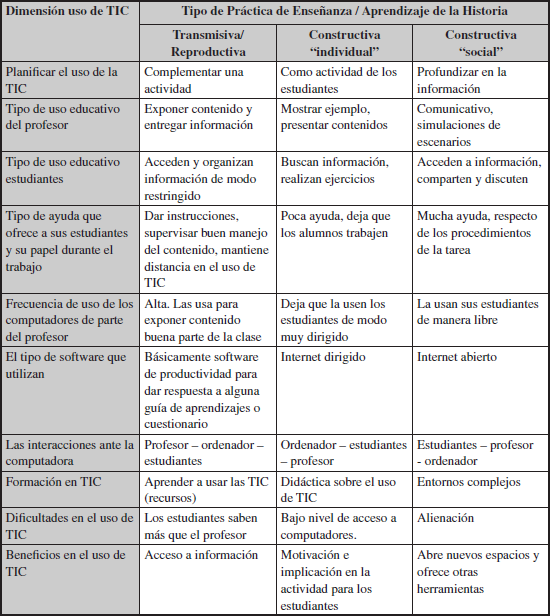 Lo analizado, nos lleva a plantearnos la pregunta respecto de qué tipo de relación existe entre las concepciones de los profesores de Historia sobre aprender y enseñar con los tipos de usos educativos que despliega en sus clases con uso de TIC, dado que lo que nos refleja la evidencia es que según un tipo de concepción habría asociada un tipo de práctica que incide en la construcción de aprendizaje escolar (Arancibia, Badia, Soto y Sigerson, 2018; Inan, Lowther, Ross y Strahl, 2010).