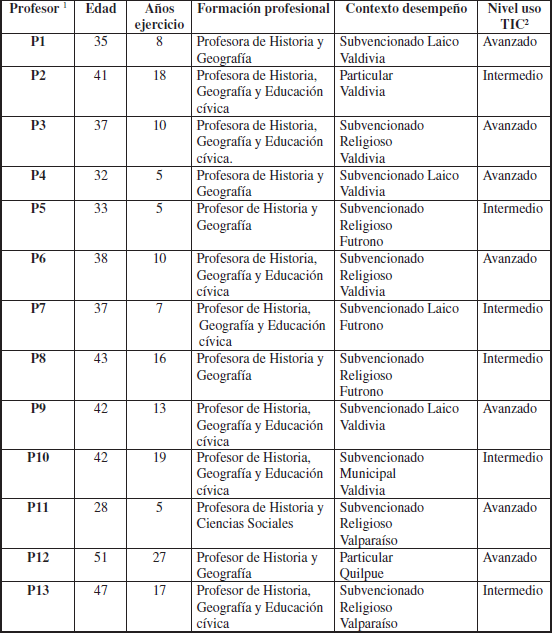 Para intentar responder al problema planteado se propone un estudio de casos de tipo múltiple (Stake, 1999) organizado en dos etapas. Se aplican entrevistas semiestructuradas en profundidad y el registro en video de 13 Secuencias Didácticas (en adelante SD) de profesores de Historia en Chile, en cuatro ciudades (Valparaíso, Quilpué, Valdivia y Futrono) en dos regiones (Los Ríos y Valparaíso) y que se desempeñan en establecimientos educacionales de los tres tipos de dependencia administrativa que existe en Chile (Particular, Subvencionado y Municipal). A continuación, en el cuadro 2 se caracterizan los 13 casos: