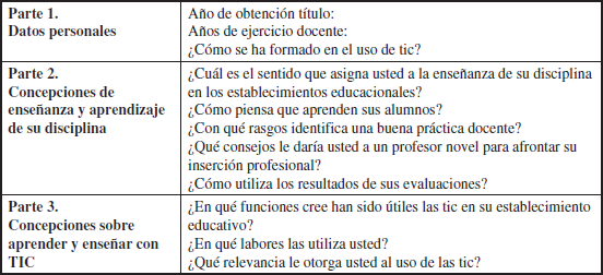 La primera etapa de aplicación de una entrevista semiestructurada que, según Flick (2004), es un método clave para reconstruir teorías subjetivas, para lo cual debe recoger de los entrevistados los supuestos explícitos e inmediatos que se expresan casi espontáneamente en las respuestas a las preguntas definidas. A continuación, en el Cuadro 3 presentamos ejemplos de preguntas: