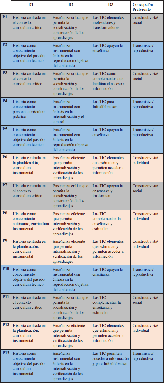 El cuadro 4 presenta la clasificación de los profesores por concepción preferente luego del análisis fenomenográfico de las entrevistas (dimensiones, categorías y subcategorías). Como allí se puede apreciar cuatro profesores fueron clasificados como Constructivista/social, cuatro profesores Constructivista/individual y cinco profesores Transmisivo/reproductivo. Esta distribución, lograda con el principio de saturación de los datos, nos permite tener un cuadro muy bien distribuido, para luego encontrar las asociaciones entre las prácticas con uso de TIC con las concepciones que tienen los trece profesores de Historia agrupados por concepción preferente.