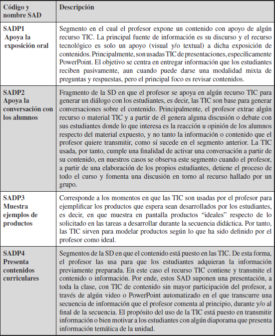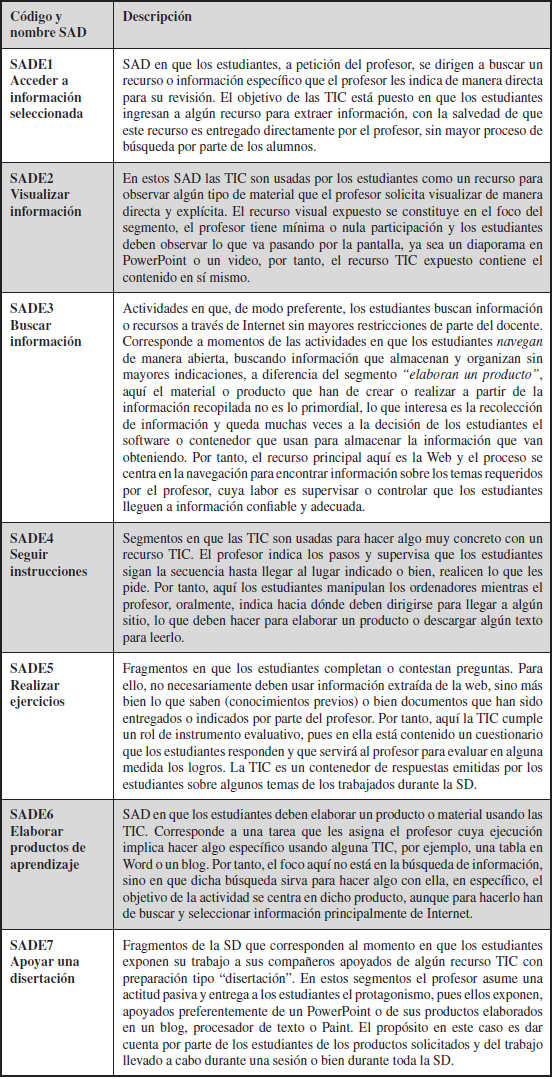 A continuación, en los cuadros 5 y 6 se describen los SAD encontrados en las 13 SD, las que están constituidas por un total de 3134 minutos de video distribuidos en 49 sesiones de clases. El Cuadro 5, muestra 4 SAD en que el profesor usa exclusivamente las TIC, codificados como SADP. En el Cuadro 5 se describen 7 SAD en los cuales los estudiantes utilizan las TIC, y se les asigna el código SADE. Si bien se observa que son más diversas las actividades en que las TIC son usadas por los estudiantes, en contraste a los segmentos en que las TIC son usadas por los profesores, sin embargo, en ambos no existe mucha diversidad.