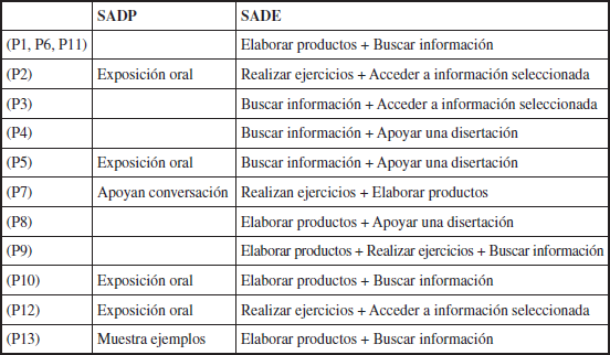 En síntesis, los SAD que se han encontrado en las trece SD dan cuenta de una homogeneidad de usos de parte de profesores y estudiantes. Los cuatro SADP se concentran básicamente en modos de pasar contenidos o modelar productos, en otras palabras, se usa un recurso previamente creado ya sea por el profesor (PowerPoint), por sus estudiantes (blog) o agentes externos (video). En tanto, los 7 SADE en que los estudiantes usan las TIC se caracterizan por ser tipos de uso básicamente referidos a navegación en la Web o en recursos para apoyar exposiciones, con una baja presencia, por un lado, de usos creativos orientados a la publicación o construcción de ambientes digitales (Sigalès, Mominó, Meneses y Badia, 2009) y, por otro lado, de usos comunicativos encaminados a la publicación y discusión de los contenidos o uso de redes sociales (Cobo y Moravec, 2011).