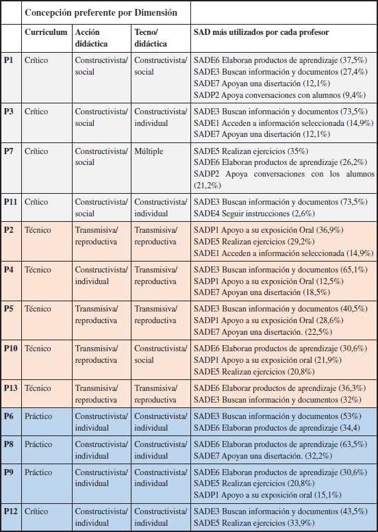Clasificados los profesores en concepción preferente y descritas sus prácticas con uso de TIC, en el cuadro 8, para responder a nuestra pregunta, se muestra para cada profesor las relaciones entre concepciones preferentes en cada Dimensión y los SAD más utilizados en las SD.