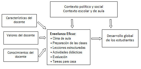 Además, esta enseñanza eficaz se ve influida y definida tanto por las características, valores y conocimientos del docente (Adegbile y Adeyemi 2008) como por el contexto de escuela, político y social en el que se desarrolla su trabajo (Darling-Hammond 2000). Con todo ello, en el Gráfico 1 se tiene una imagen global del marco teórico de la presente investigación.