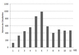 Según el nivel socioeconómico de las familias, codificado en 11 alternativas (1 menor, 11 mayor), la distribución de los estudiantes se corresponde con una curva Normal, algo platicúrtica (menos apuntada y con colas menos anchas que la normal) y con una ligera asimetría a la izquierda (gráfico 3).