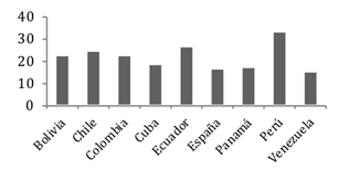 La media de estudiantes por aula es de 23 estudiantes, con un mínimo de 6 y un máximo de 44. El país donde las aulas cuentan con mayor número de estudiantes es Perú con una media de 33 estudiantes por aula, seguido de Ecuador (26 estudiantes) y Chile (24 estudiantes) (gráfico 4).