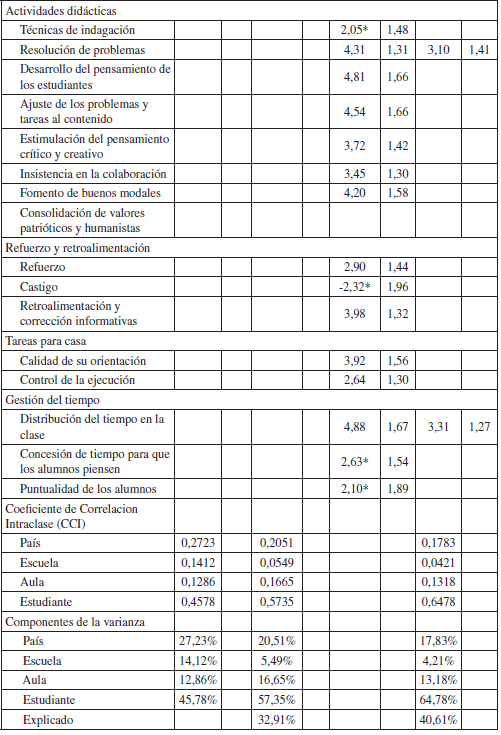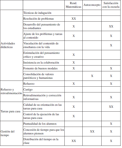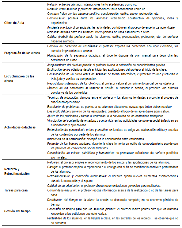 Los resultados encontrados demuestran la existencia de siete factores que inciden de manera significativa sobre el desarrollo de académico y socio-afectivo de los estudiantes: Clima de aula, Preparación de las clases, Lecciones estructuradas, Actividades didácticas, Evaluación y retroalimentación, Tareas para casa, y Gestión del tiempo.