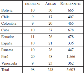 La muestra estudiada está conformada por 5.603 estudiantes de 248 aulas de tercer curso de Primaria de 98 escuelas de nueve países de Iberoamérica (Bolivia, Chile, Colombia, Cuba, Ecuador, España, Panamá, Perú y Venezuela). Como criterio general se planteó estudiar diez escuelas públicas de cada país en las que se impartiera Educación Básica/Primaria. Sin embargo, Chile, Colombia y Venezuela obtuvieron datos de nueve escuelas; Ecuador analizó 11 escuelas; y Perú, decidió ampliar el número de escuelas a 20 (tabla 3). Análisis previos realizados indican que esta ampliación de la muestra de Perú, no altera los resultados.