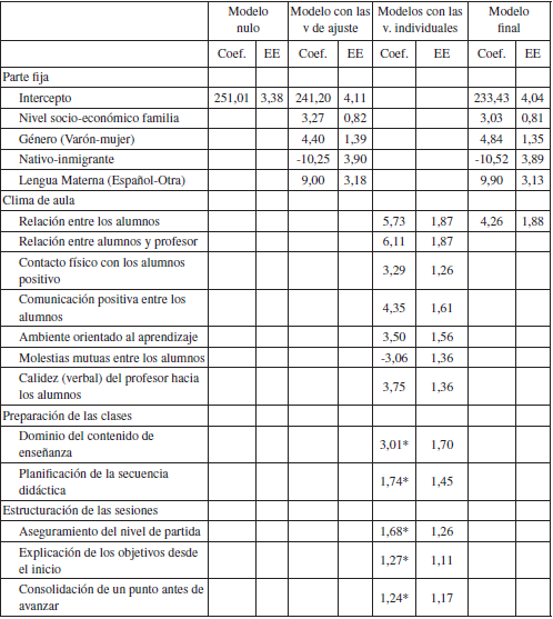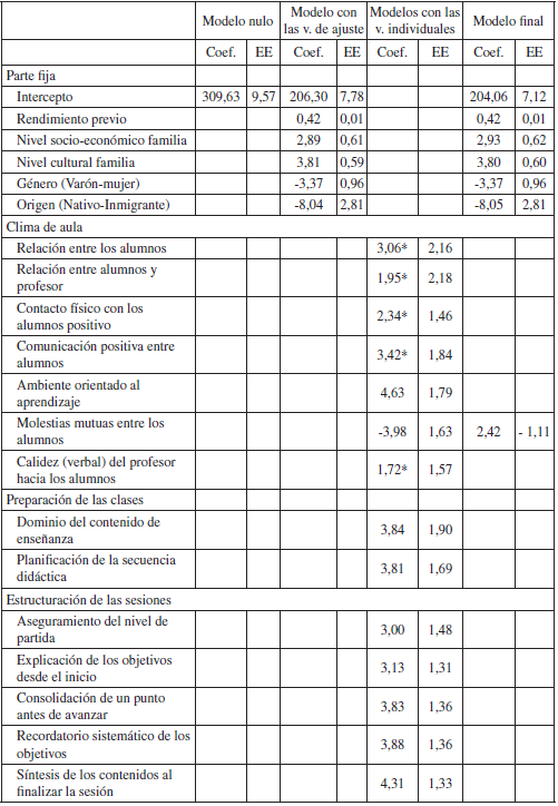 En la tabla 3 se presentan los resultados del proceso de modelamiento multinivel para la variable producto rendimiento en Matemáticas. Como muestra el modelo final, una veintena de variables han realizado una aportación significativa, con lo que puede considerarse como factores asociados al logro en Matemáticas (Tabla 4).