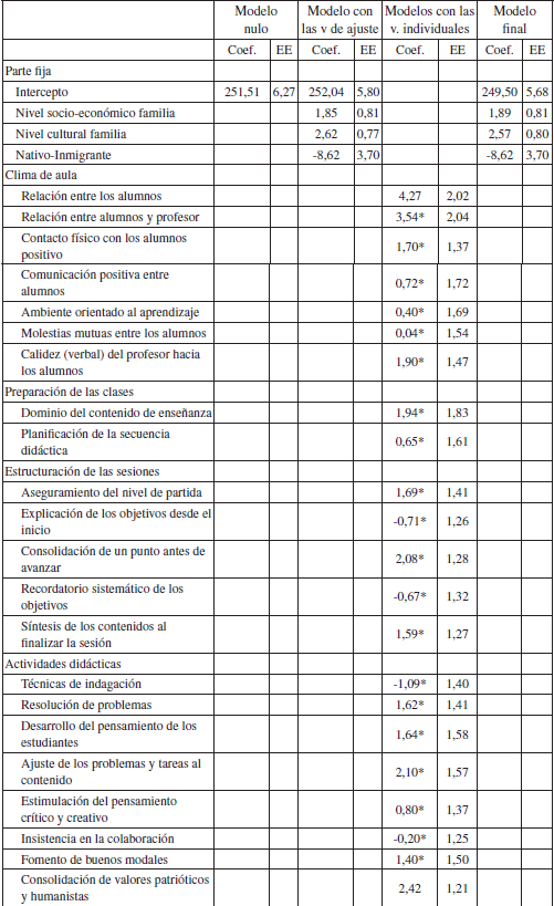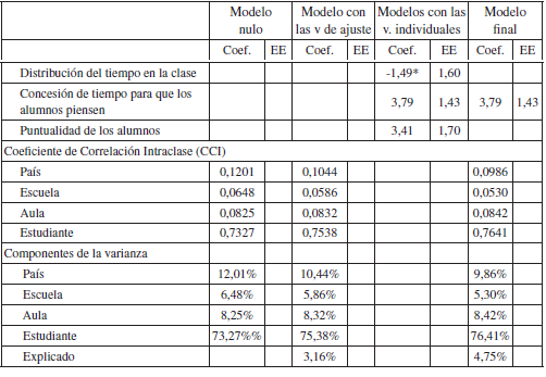 Mucho más interesante para los propósitos de esta investigación es, sin embargo, el estudio de los modelos en los que se han incorporado las variables de proceso de forma individual. En este caso, sólo cuatro variables han realizado una aportación significativa: Relación entre los alumnos, Consolidación de valores patrióticos y humanistas, Puntualidad de los alumnos y Concesión de tiempo para que los alumnos piensen. De estas cuatro, sólo una aparece en el modelo final, la concesión de tiempo para que los alumnos piensen.