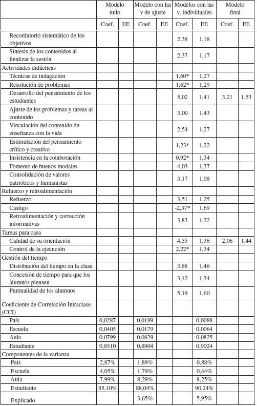 Se utilizaron los Modelos Multinivel de cuatro niveles de análisis para determinar la relación entre las diferentes variables de Enseñanza Eficaz y el desarrollo de los estudiantes. El procedimiento de análisis multinivel para cada una de las variables producto fue: