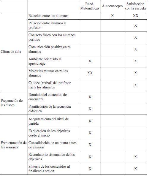 El factor denominado estructuración de las clases y conformado por variables tales como Aseguramiento del nivel de partida, Explicación de los objetivos desde el inicio, Consolidación de un punto antes de avanzar, Recordatorio sistemático de los objetivos, y Síntesis de los contenidos al finalizar la sesión, tienen una incidencia significativa sobre el rendimiento de los estudiantes en Matemáticas. Sin embargo, no parece tener incidencia en el autoconcepto del estudiante y sólo las dos últimas variables, en su satisfacción.