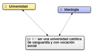 Se asocia el código de universidad al de ideología en la medida que la institución universitaria se autodefine como católica (sistema de creencia según van Dijk 2008) pero no se hace patente la posibilidad de redefinir o asociar los dos códigos ya que la cita no es lo suficientemente explícita para poder indicarnos si una es causa de la otra o viceversa.