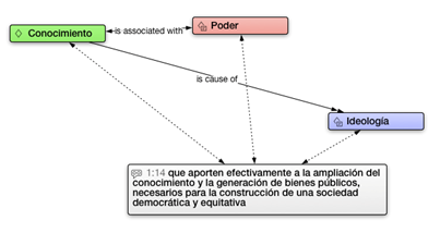 La asociación entre conocimiento es simétrica y confluyen en la cita representada anteriormente. Se instala un tercer nivel que se desprende del código conocimiento el cual es la ideología como causa directa y explicativa de los elementos implícitos en la cita, mientras que se asocia el poder con el conocimiento, elevando el nivel de complejidad manifestado en los análisis previos. ¿Qué significa que estos códigos estén asociados? Significa que según los enunciados de Foucault y los autores de este trabajo, el conocimiento está presente mientras se habla de poder (la generación de bienes públicos) y que el poder está relacionado al conocimiento en la medida que brinda los elementos de los cuales el conocimiento debe hacerse cargo, como la elaboración de un campo del saber, la orientación (formal o informal) de proyectos de investigación, etc.