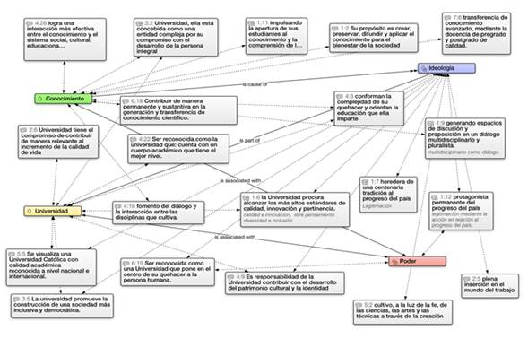 En este nivel nos encontramos con una densidad de asociación que supera (o profundiza) las categorías anteriormente analizadas complementadas con todos los documentos analizados, y donde podemos encontrar espacios de pertenencia, como lo es el caso de la relación entre ideología y universidad o de causalidad como lo es el de ideología y el conocimiento y por supuesto las asociaciones ya vistas entre poder, conocimiento y universidad. ¿Qué significan estos niveles de asociación? Cualitativamente nos indican que el conocimiento es una causa de la ideología lo que podría contrastarse con la asociación que se hace con el poder, es decir, existen lógicas de poder que regulan el conocimiento y que este, a su vez, genera lo elementos prácticos y teóricos de una ideología, sin olvidar que esta última es un sistema de creencias. También nos indica, gracias al código de universidad que en este caso fue utilizado para visibilizar la identidad con la que las universidades se presentan a la comunidad, que la institución universitaria se instala en un campo definido por las lógicas de poder y las lógicas de ideología, cuya representación se ha observado atentamente en los anteriores análisis (ver figura 4).