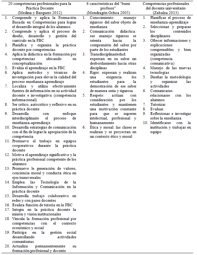 De estos varios estudios, destacan los realizados por Medina y Barquero - en el que se evaluaron 500 profesores (autoevaluación, evaluación y reflexión) de licenciatura y de posgrado, y 10.000 estudiantes, para identificar 20 competencias-clave que deben presentar los profesores en su perfil-(Medina y Barquero 2012), el de Mondragón Ochoa en el que los estudiantes destacan seis factores presentes en los “buenos profesores” y el de Zabalza que propone diez competencias presentes en el docente universitario (Mondragón Ochoa 2005; Zabalza 2013). La tabla 1 resume lo propuesto por estos tres estudios.