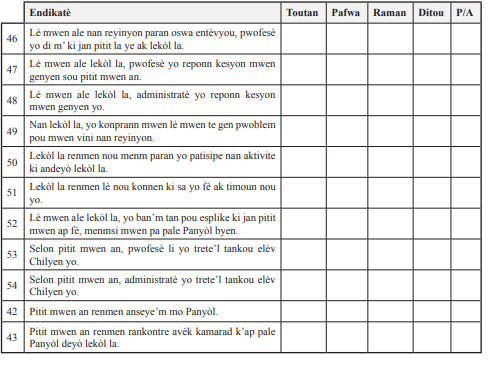 Premye pati Sonje pou’w make ak yon iks (X) opsyon ki pi apwopriye selon pèsepsyon ou. Si ou wè as yo di a pa gen rapò avè’w, chwazi Pa Aplikab (P/A).
