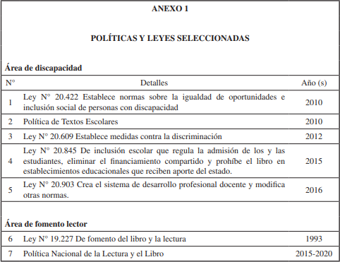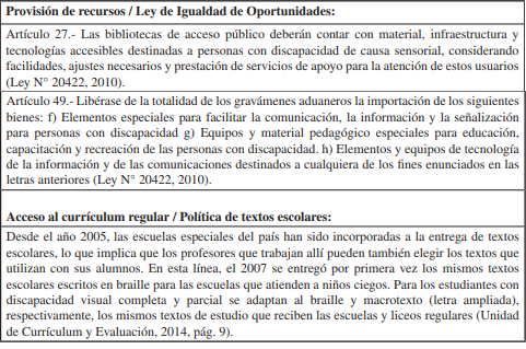 En consecuencia, de un total de siete documentos revisados, solo en cuatro políticas y leyes vigentes hay menciones explícitas, desde que empiezan a tener relevancia estos temas en la agenda pública -1990-, lo cual da cuenta de una precariedad y escasa articulación de las mismas y la necesidad de hacer tanto de la lectura como de la discapacidad temas transversales a la sociedad, puesto que la preocupación central está en dar acceso a materiales de lectura, sin profundizar respecto al tipo, calidad o variedad de los mismos.