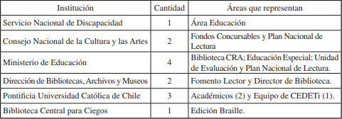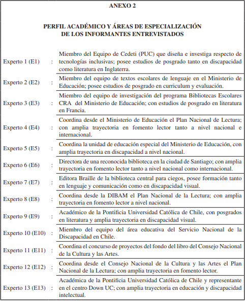 Para la producción de datos, se formó un grupo de expertos compuesto por actores políticos, los cuales tienen una amplia experiencia en cargos de alta responsabilidad en instituciones públicas dedicadas al fomento lector o discapacidad, y por académicos con experiencia profesional e investigativa en uno o ambos temas. Inicialmente, mediante la estrategia de muestreo oportunista (Miles & Huberman, 1994) se convocó, a través de correo electrónico a nueve informantes y posteriormente, mediante la estrategia de bola de nieve (Miles & Huberman, 1994), es decir, contactos que establecieron los mismos entrevistados con otros expertos, se logró incorporar cuatro informantes más. La siguiente tabla resume las instituciones y áreas a las que pertenecen los 13 informantes que conforman el grupo de expertos (mayor detalle en anexo 2):