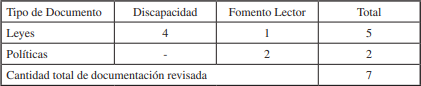 En cuanto a las técnicas de producción de datos, se emplearon los criterios orientadores de impacto y actualidad (Boote & Beile, 2005) para seleccionar las documentos; de modo que se incluyen políticas públicas de alto impacto, es decir, solo las que tienen carácter de ley o política que se encuentran vigentes hasta la actualidad, promulgadas entre los años 1990 a 2017 y que refieren a discapacidad o fomento lector (mayor detalle en anexo 1). A continuación, se muestra el tipo de documento, el tema al que pertenece y sus respectivas cantidades: