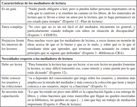 Los expertos destacan la figura y el rol que tiene el mediador de la lectura, describiéndolo y reconociendo en su tarea una gran responsabilidad, la que podría ir desde orientar la búsqueda de un determinado libro/autor, hasta mediar respecto a significados o contenidos en las lecturas; esta amplitud en las responsabilidades da cuenta de que sus roles y funciones no están claramente establecidos. En este sentido, uno de los problemas que visualizan los expertos en esta figura, es que no respete el interés genuino de un lector a causa de sus propios prejuicios como mediador, y que, en lugar de orientar y alimentar la motivación intrínseca del lector, imponga lo que a su parecer es más apropiado según la edad, el género, el tema, el reconocimiento del autor, entre otros múltiples criterios de selección de materiales de lectura.