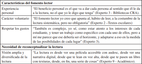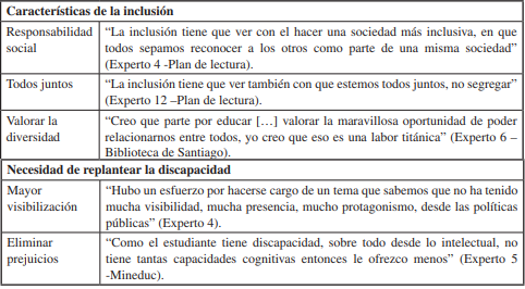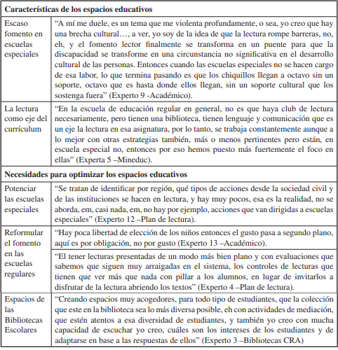 Como producto del análisis de las entrevistas, surgen tres grandes categorías que cobran mayor relevancia en la consulta a los expertos: necesidad de redefinir los conceptos de discapacidad y lectura, y limitaciones tanto en los espacios como en los recursos. Cada categoría es descrita -en palabras de los entrevistados- para posteriormente detallar las necesidades que emergen en torno a esta, de acuerdo con las consideraciones de los expertos.