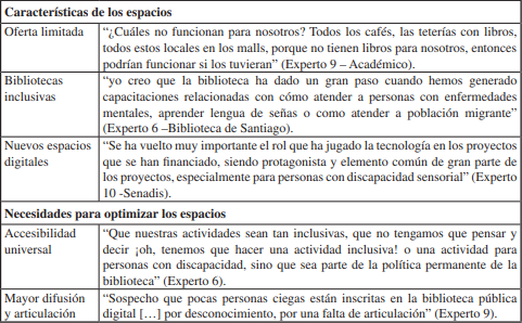 Los expertos describen que existen determinados espacios que no cumplen con la función de fomentar la lectura para las personas con discapacidad, ya sea por temas de accesibilidad en la infraestructura o en la oferta limitada que tienen en los materiales de lectura. Estos espacios que están pensados con la única finalidad de fomentar la lectura, no son realmente inclusivos, debido a una conceptualización restringida de lo que es leer. No obstante, se reconocen ciertos progresos en los espacios que logran ser inclusivos para toda la diversidad -y no solo para las personas con discapacidad-, y ejemplo ello son las bibliotecas que se han adjudicado el sello inclusivo2.