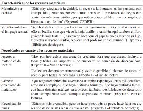 Del mismo modo, en ambos estudios cobra relevancia el tema de los recursos, en el sentido de asegurar el acceso a recursos materiales para que los estudiantes en situación de discapacidad progresen en el currículum nacional prescrito, lo que da cuenta de una preocupación básica e insuficiente por parte de las legislaciones de Estado, ya que solo se apunta a dar acceso, y no ha habido políticas públicas que avancen en propender a garantizar calidad en dicho acceso, etapa todavía más necesaria en la construcción de una verdadera educación inclusiva (Cox, 2007). Es inegable que personas en situación de discapacidad tienen una deficiencia o limitación ya sea de origen intelectual, sensorial o psíquica (Ley N° 20422, 2010), pero no por ello debe quedar restringuido su acceso de manera libre a materiales o formatos de lectura; de igual manera, es vital que los mediadores de lectura se encuentren especificamente preparados en estos temas, de modo que tanto los recursos materiales como humanos respondan eficiente y oportunamente a las inquietudes, necesidades o intereses lectoras de este grupo.