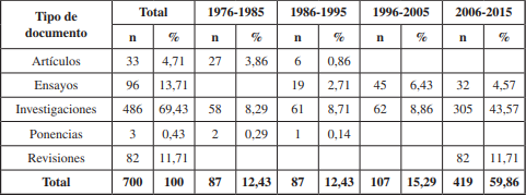 La cantidad total de documentos asciende a 700 (Tabla 1), primando las investigaciones (69,43%) seguidas por los ensayos (13,71%). Su evolución temporal muestra una tendencia creciente siendo la década 2006-2015 la que reúne un 59,86% del total de documentos publicados.