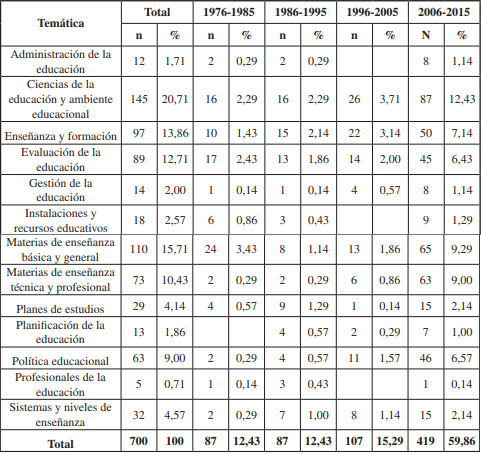 La distribución por década de estas temáticas muestra la evolución temporal de los intereses de los investigadores, siendo las ciencias de la educación y ambiente educacional un tema principal en todas ellas. Con excepción de este tema principal, la temática más destacada en la década de 1976-1985 fue materias de enseñanza básica y general (3,43%), mientras que en las décadas 1986-1995 y 1996-2005 fue enseñanza y formación (2,14% y 3,14% respectivamente).